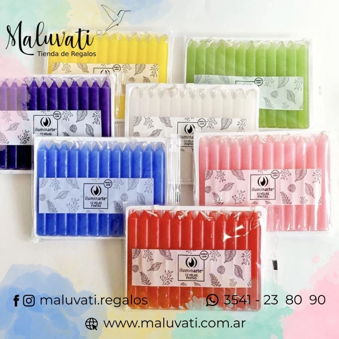 | Velas finas x12 | Amarilla, Blanca, Celeste, Roja, Rosa, Verde manzana, Violeta |